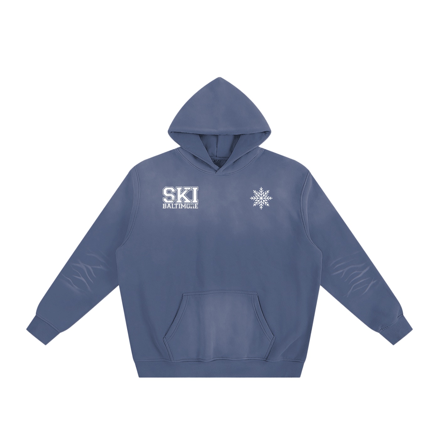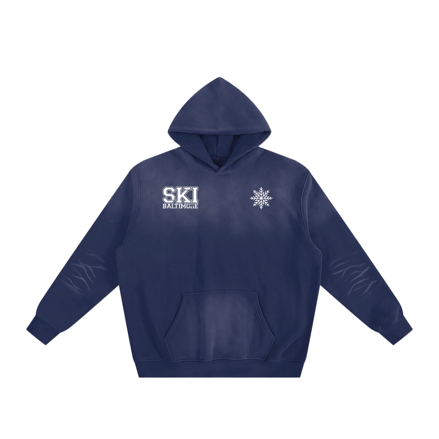 The Big Motion Hoodie fuses heritage design with modern craftsmanship. Featuring Ski Baltimore’s collegiate wordmark and signature Snowflake logo on the front, the back memorializes the social club’s championship outing at the ‘All-Snow Invitational’ in 2020. Each hoodie is individually monkey-washed for a unique aged look, giving it authentic vintage character. Cut from a thick 375gsm Poly-Cotton blend it delivers heavyweight warmth, structure, and unmistakable style.