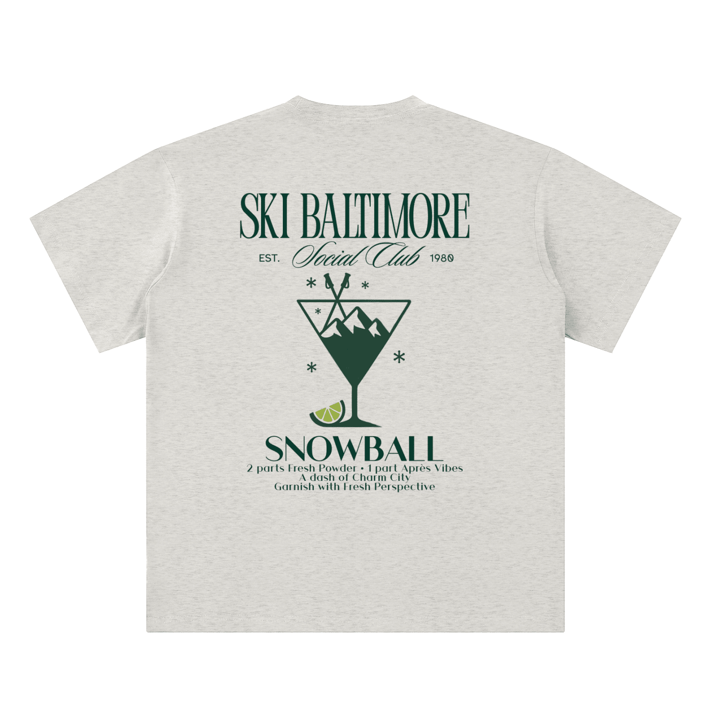 The Snowball Tee blends nostalgic Baltimore flavor with the sophistication of Ski Baltimore’s Social Club aesthetic. Inspired by the city’s signature summer treat, this design turns a local staple into a refined cocktail concept. Made from 100% sueded cotton for an exceptionally smooth hand feel, it features the Ski Baltimore snowflake logo on the front and the “Snowball” cocktail artwork on the back — complete with recipe details and an alpine twist.